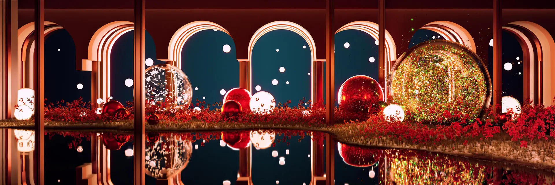 Pantheon: Christmas Wonderland is an installation based on a arch-based structure that spatializes the visual characteristics of a winter night. Across the arches, bead-like elements are arranged in repeated sequences, and their subtle movements and reflected light generate a consistent visual rhythm. Imagery of snow and flowers introduces a tension between seasonal coolness and illumination within the exhibition environment. Through repeated patterns, formal composition, and controlled light movement, the work establishes a seasonal landscape inside the gallery and proposes a new interpretation of Christmas shaped by the atmosphere of the Rockefeller Center.